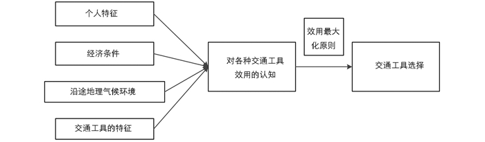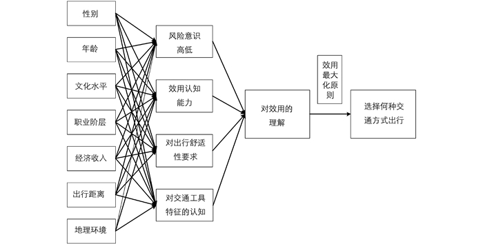 “消费者总是在预算约束下选择效用最大的产品或服务”,这是消费行为学中一条基本的理论.同样,出行者对交通工具的选择决策也遵循效用最大化原则,在对交通工具选择时总是体现效用最大化这一原则.基于该理论,得出影响出行者选择交通工具的4个主要因素:出行者的个人特征、经济条件、出行途经的地理、气候环境和交通工具的特征.这些因素决定出行者对交通工具效用的认知,进而影响交通方式选择决策,逻辑框架图如图 2所示.