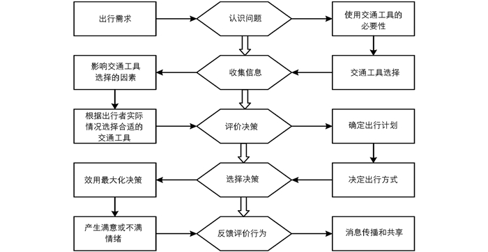 认识问题阶段是出行者根据自身需求产生的出行决定,这个阶段出行者需要明确出行的目的和一些必要条件等问题,确定是否有必要选择交通工具,达到必要认知条件后就开始对交通工具进行选择.收集信息阶段是在出行者确定出行需求后,就开始进行交通工具的选择,出行者根据自身实际情况选择合适的交通工具,并对选择的交通工具做出评价,从而确定出行方式.出行工具的选择符合消费行为学,都以效用最大化为主要原则,最后出行者对选择决策后的结果产生反馈评价行为,为他人决策提供信息.下面对影响出行者选择交通工具的因素和选择决策做具体分析.