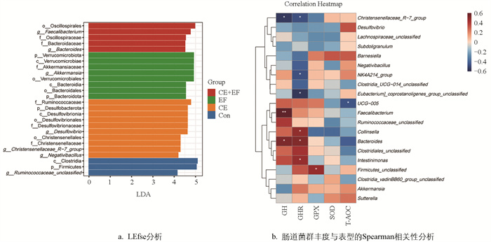不同饲粮组间LEfSe分析和肠道菌群丰度与表型的相关性分析