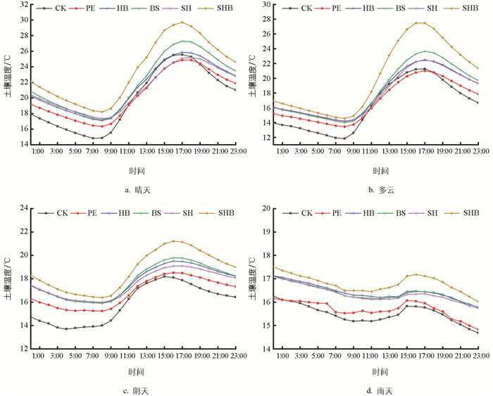 不同天气条件与地膜覆盖下土壤温度的日变化