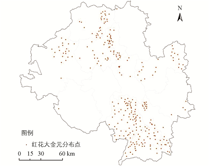 图 2 红花大金元分布点