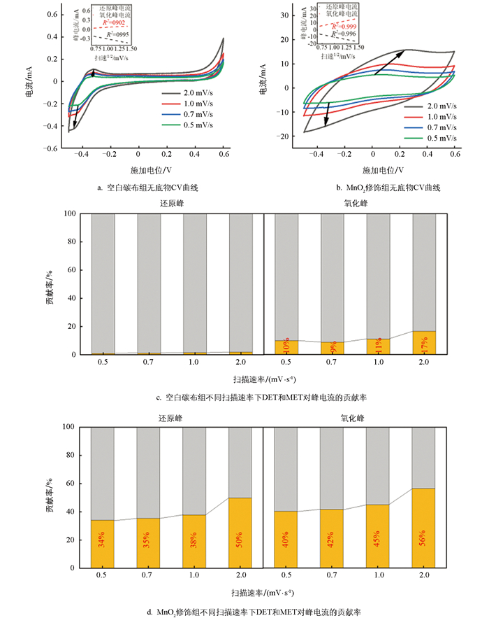 图 6 不同扫描速率下的无底物CV以及不同扫描速率下DET和MET对峰电流的贡献率