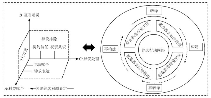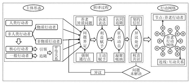 一是过程性视角的整合价值。对行动者网络理论的运用,融合关联了场域、多元协同治理和边界等多种理论视角。从主体位置来看,养老行动网络是一个由不同行动位置所形成的关系场域,不同养老行动者占据不同位置进行权责博弈,最终形成关系构型;从协同过程来看,养老利益相关主体围绕既定目标共同参与、携手合作,并根据内外部环境和自身资源禀赋及时调控,以提高协作效率;从网络边界来看,养老行动者会依据业务领域、胜任能力和优势专长形成与其他行动者相区别的时空界限,并在互动中不断调整边界范围。