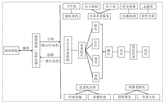 在养老行动网络中,核心行动者和一般行动者形成了双向互动、紧密联结的结构关系(见图 2)。作为核心行动者,政府机构在养老行动系统中居于兜底、运营和监管的主导地位,承担引领一般行动者参与养老行动、实现网络联结的责任。“我们主要工作内容就是业务指导、监督检查。”(民政局—工作人员—A01) 而制度政策和法律法规等作为政府机构发挥养老功能的非物质实体产物,是产生互动行为和行动情境的重要载体和中介。在一般行动者方面,各主体也都紧紧围绕着H机构以寻求获取“代言人”的资格行使权限,并在核心行动者的规范下形成了严密的组织架构和责任边界。“在政府指导支持下,我们岗位职责分工明确。并且成立了自治管理委员会,还有不同的生产生活小组。”(敬老院—业务院长—C01)