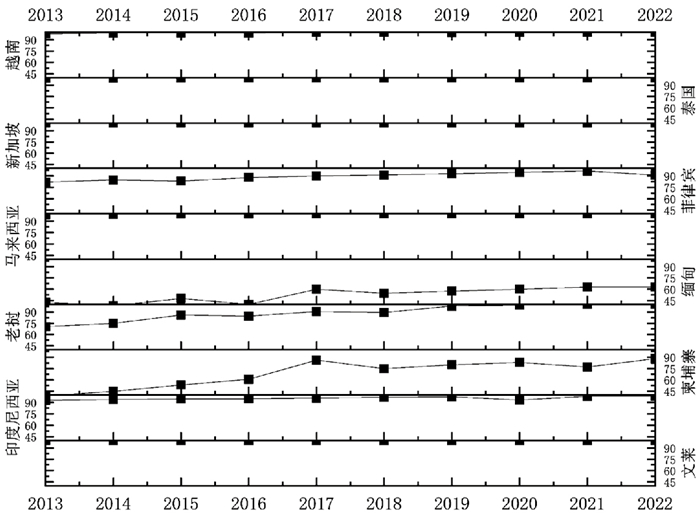 第二,夯实能源基础,改善民生水平。补齐东盟公共资源短板,能源水电建设至关重要。中国依托广西、云南地缘优势,协助东盟国家建设水电站与跨境电网,提升其农村地区电力覆盖面积。截至2022年,除缅甸农村通电率为62.8%外,其余东盟国家已达88%~100%(见图 3),居民用电情况显著改善,生活质量有效提升。此外,中国“走出去”企业主动履行社会责任,如2017年中缅油气管道典范先行,稳供能源,护持民生可持续,为共建机制深入推进奠定社会基础。