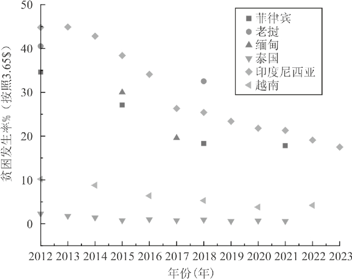 第二,深耕投资,创造机遇惠民生。助力贫困人口自主就业是确保减贫可持续性的有效手段。统计显示,十二年来,中国在东盟的25个经贸合作区创造了10余万个就业岗位[32],惠及大量贫困人口,有效缓解了区域发展失衡难题。如泰中罗勇工业园为本地提供了5万余个岗位,其中90%是本地员工[33];西哈努克港经济特区就业人数由2013年的9 000人增至2023年的近3万人[34];中印青山园区带就业人口超6.7万[35];中马铁路项目培养了5 000名本土技术人才[36]。据世界银行最新数据,2012年至2024年间,东盟国家极端贫困率显著下降(见图 5),如菲律宾从10.9%降至3%,印尼从10.6%降至1.9%,老挝从10.9%降至7.1%。虽然部分国家在个别年份贫困发生率有小幅度波动,但多数国家贫困发生率呈下降态势,直接体现出贫困人群规模在缩小。另外,按每日3.65美元标准衡量的贫困发生率也持续走低,反映出区域内整体生活水平提升及相对贫困状况改善(见图 6),而中国—东盟减贫合作的贡献格外显著。