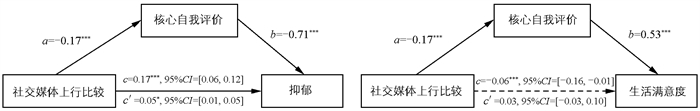 假设2:核心自我评价在社交媒体上行比较与中职生抑郁、生活满意度间起中介作用。