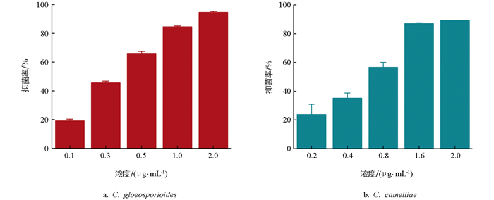甲基硫菌灵处理后,两种炭疽菌C. gloeosporioides(图 3a)和C. camelliae(图 3b)的EC50分别为0.349、0.647 μg/mL,表明甲基硫菌灵对C. gloeosporioides抑菌活性更高,在较低的浓度下能达到更好的抑制效果,且随着药剂浓度的增加,抑菌率逐渐增大。浓度为1.0 μg/mL时,甲基硫菌灵对C. gloeosporioides的抑菌率可达84.56%,2.0 μg/mL时可达到94.61%。相比之下,甲基硫菌灵对C. camelliae的抑菌率在浓度1.6 μg/mL时为86.99%,2.0 μg/mL时为89.04%。综上所述,在较低的浓度下,甲基硫菌灵对C. gloeosporioides具有更好的防治效果。