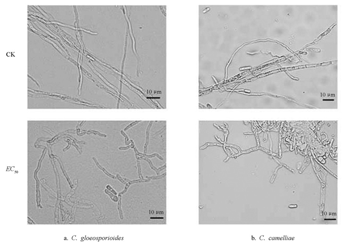 图 4显示,正常生长下两种炭疽菌的菌丝整体形态均匀且较直,甲基硫菌灵(EC50)处理后,两种菌的菌丝形态均呈现出不同程度的局部增粗,大部分菌丝的顶端产生不规则膨大,菌丝整体生长也呈现畸形,表明在甲基硫菌灵的作用下,菌丝顶端分生组织的生长受到抑制,使得菌丝的生长发育变得缓慢甚至停止。