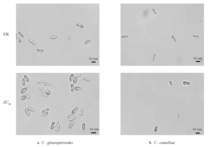 图 5显示,正常生长的孢子生长发育良好,形态呈较为规则的长椭圆形,大小较为一致。C. gloeosporioides的分生孢子呈长圆柱形,孢子整体透明,内部无隔膜,两端钝圆,大小为12.60~18.50 μm(长)× 4.30~7.50 μm(宽);C. camelliae的分生孢子呈圆柱状,末端呈钝形或向底部狭窄,整体透明,内部无隔膜,大小为11.7~18.9 μm(长)×4.1~7.61 μm(宽)。甲基硫菌灵(EC50)处理后,分生孢子整体数量呈减少趋势,部分分生孢子生长明显受到抑制,在形态上表现为局部不规则膨大。