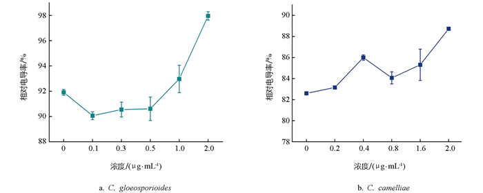 细胞膜透性以细胞相对电导率的大小表示[12]。结果表明,两种炭疽菌在甲基硫菌灵的处理下,菌丝相对电导率随着甲基硫菌灵浓度的增加整体呈现上升趋势,相比之下,C. gloeosporioides电导率相对稳定地升高(图 6a),C. camelliae变化幅度波动较大(图 6b),表明在甲基硫菌灵作用下,2种炭疽菌的细胞膜均被损伤,且随药剂浓度的增大损伤程度加剧。