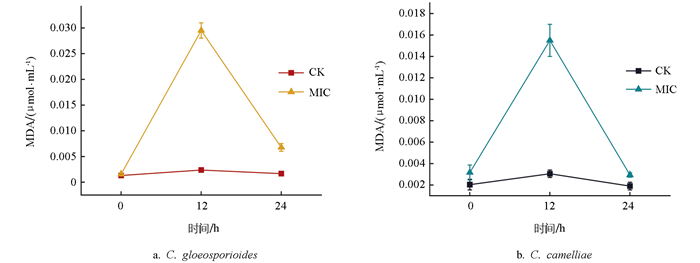 丙二醛(MDA)是细胞在逆境胁迫下脂质过氧化作用的主要产物之一,由于MDA本身具有较强的毒性,可以在生物代谢中对细胞膜结构造成损伤,从而破坏细胞膜,影响细胞的功能[13]。在甲基硫菌灵处理后24 h内,两种炭疽菌的MDA含量均在12 h内呈现出急剧上升、而后又急剧下降的趋势,而对照组(CK)变化不大(图 7),但C. gloeosporioides的上升幅度明显大于C. camelliae,说明甲基硫菌灵对C. gloeosporioides的组织过氧化损伤程度更大,尤其是在12 h后。