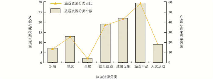 本研究选择河北省平山县西柏坡作为样本,因为该地区拥有独特的红色旅游资源、丰富的生态和文化底蕴,同时也面临着乡村旅游经济发展的实际挑战。河北省平山县西柏坡位于河北省石家庄市平山县迎宾路,地处太行山东麓[8]。该地区作为国家AAAAA级旅游景区,是中国革命纪念地之一[9-10]。河北省平山县西柏坡的旅游经济主要依赖于旅游业和绿色食品开发加工业[11]。此外,河北省平山县西柏坡还拥有丰富的红色旅游资源和民俗文化资源,其旅游资源主要包括水域、地文、生物、遗址遗迹、建筑设施等景观[12-13],以及旅游产品、人文活动等项目。河北省平山县西柏坡全域的旅游资源分类情况如图 1所示。