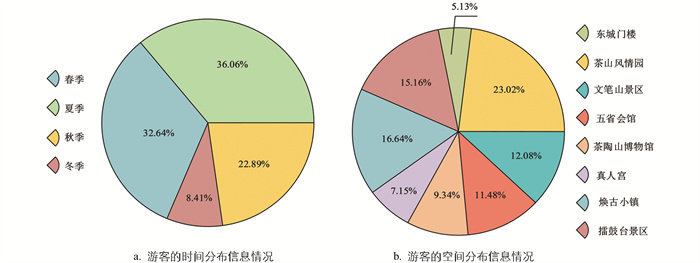 由图 1可知,在河北省平山县西柏坡全域旅游资源分类中,旅游产品的占比最高,达到了29.06%; 其次是建筑设施景观和遗址遗迹景观,分别占比为21.67%和18.71%; 生物景观占比最低,仅为1.97%。数据表明该地区拥有丰富的地方旅游产品、人文景观以及民间习俗等旅游资源,反映了其悠久的历史沉淀和丰富的文化底蕴。旅游资源分布情况是评估当地旅游开发潜力的重要指标,河北省平山县西柏坡各个旅游资源点之间聚集度较高,且相距较近,主要分布在河北省平山县西柏坡的东南方向和北侧[14-15],旅游交通之间连通性较强,景点之间交通较为便利。不同类型旅游资源之间具有较强的组合性,例如遗址遗迹与地方旅游产品等资源可以进行有效的组合发展。综合来看,该地区旅游资源分布集中,具有较大的开发潜力。从以往的旅游市场经验来看,该地区的游客主要来自省内,其次是周边省份。从游客偏好来看,自然风光和历史文化古迹等旅游资源更受游客青睐。游客的时空分布信息情况如图 2所示。