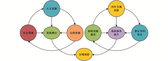 由图 3可知,要实现全域旅游经济发展,需要实现人文资源、自然资源以及社会资源的复合化,将它们各自的资源特征进行融合,以相互推动的方式来实现资源整合,同时将各资源要素进行聚集,从而生成具有动静结合特点的全新资源。在旅游基础建设和服务方面,需要提高基础设施建设水平、优化景区布局、加强内外交通连接等来提升河北省平山县西柏坡地区的旅游服务功能,并通过实现乡村旅游的城乡结合和智慧旅游等特点来提高游客的体验度和感受度。乡村旅游经济发展方向如图 4所示。