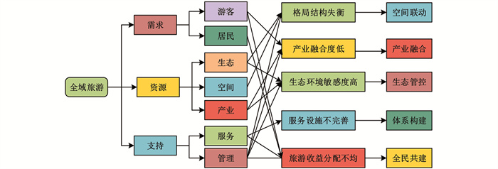 由图 4可知,乡村旅游经济发展方向主要分为需求、资源和支持3个方面。在需求方向上,需要考虑游客和当地居民的需求,包括提升游客感知度以及满足当地居民经济需求等,以此来制定相应的旅游规划。在资源方向上,注重生态、空间以及产业资源的合理利用,包括维护生态平衡、规划旅游空间布局以及开发旅游产品和产业等,以此来提升当地旅游文化产品的知名度。在支持方向上,注重基础设施服务、旅游政策和资金管理等方面,以制定相应的策略来实现河北省平山县西柏坡经济、文化、社会和生态发展目标。其中,游客数量导致旅游收益分配不均的问题,本质上是旅游经济“量增”与“质优”失衡的产物,其核心表现为游客集聚产生的收益集中在少数主体手中,而成本却由当地社区、环境和基础设施分摊。这种失衡既源于利益分配机制的结构性缺陷,也与游客行为对资源的过度占用直接相关。而生态、空间和管理缺陷造成的格局结构失衡,生态环境敏感度高、旅游收益分配不均等问题,与乡村旅游经济发展方向背道而驰。管理体系落后与政策资金缺失,将导致管理体制效能低下、规划难以落实。