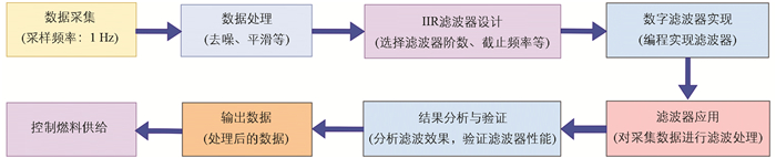 系统整体流程如图 2所示。由图 2可知,数据处理后选择适合煤量数据的IIR滤波器类型,确定滤波器的阶数以及截止频率。在选择好滤波器之后通过编写程序实现数字滤波器,将采集的煤量数据通过滤波器进行滤波处理,去除高频噪声,平滑数据,使其更接近真实值。分析比较滤波前后的数据,验证滤波器的性能和效果。通过计算误差和其他指标,确保滤波后的数据满足预期要求。最后输出经过滤波处理后的数据,用于系统控制燃料供给。
