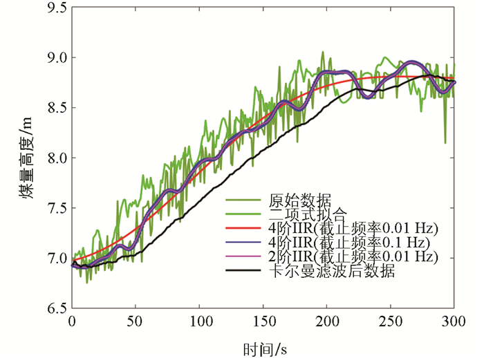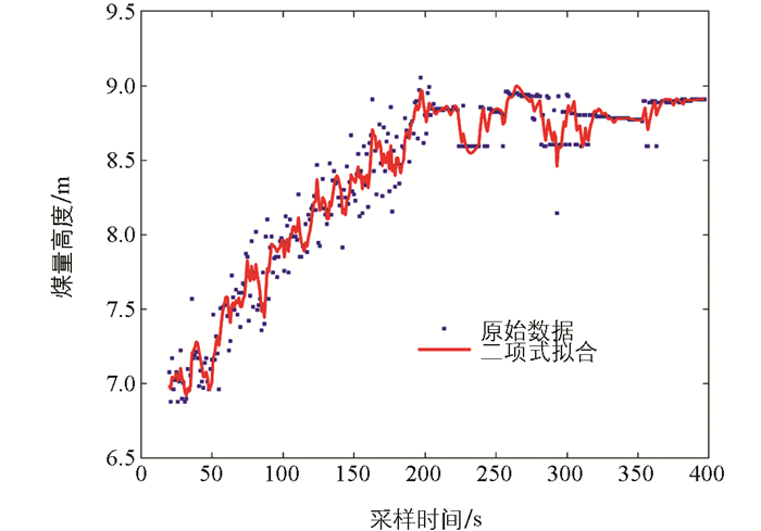 由图 3可以看出,原始数据有较大的波动和噪声,特别是在样本点较多的区域(如100~200 s和250~300 s)更加明显。随着样本点的增加,使用固定大小为20的窗口对物位计采集到的煤量数据进行滤波,其效果相较于物位计采集到的数据更加平滑,但仍然存在较多毛刺。原始数据经过二项式拟合滤波处理之后仍保留了原始数据的总体趋势。在样本点较少的区域(如0~50 s和350 s之后),拟合曲线较为平滑,说明二项式拟合在这些区间能有效降低噪声;在样本点较多且波动较大的区域(如100~200 s和250~300 s),拟合曲线基本跟随了原始数据的变化,且仍能平滑一些高频噪声。总体而言,滑动窗口二项式拟合有效地平滑了物位计采集到的数据,降低了噪声,使得数据的整体趋势更加明显,但仍存在比较明显的波动,不能有效应用于实际场景,因此不宜采用二项式拟合的方式作为最终物位计数据滤波处理的办法。