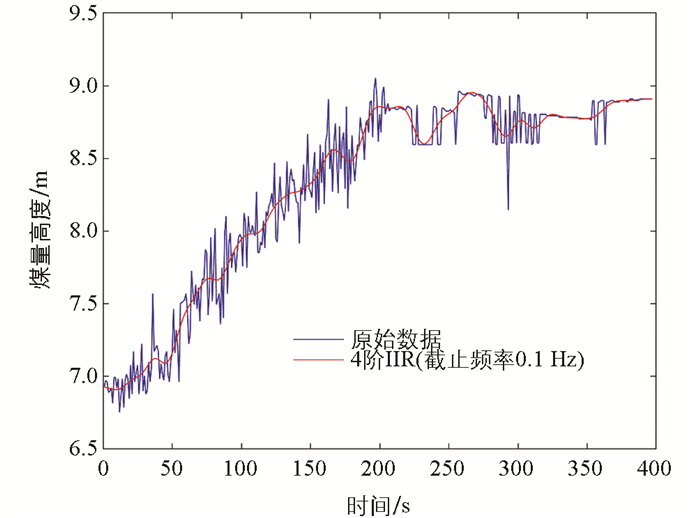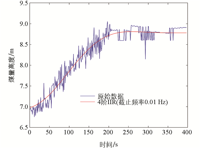 根据煤料仓煤量测量数据的特点和所面临的干扰类型(电磁干扰、温度波动、机械振动),选择适合的IIR滤波器类型。常用的IIR滤波器类型包括Butterworth滤波器、Chebyshev滤波器、椭圆滤波器等[20]。Butterworth滤波器具有平坦的通带响应,且过渡带较宽[21];Chebyshev滤波器的通带或阻带有波纹,可以获得较窄的过渡带;椭圆滤波器的通带和阻带都有波纹,但过渡带最窄[22]。考虑到需要在电磁干扰、温度波动和机械振动的条件下实现平滑的煤量测量数据,本文选择Butterworth滤波器用于设计和实现。