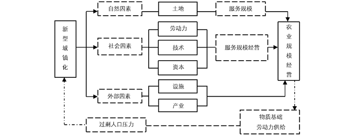 对于农业规模化与新型城镇化关系的理解主要涉及到两个核心理论:二元经济理论和规模经济理论。新型城镇化发展所带来的劳动力非农转移是农业规模经营开展的基础。现阶段城乡预期收入差距作为主要因素推动农村劳动力向城市转移,但事实上,制度、教育、心理、就业概率等因素都会影响劳动力作出是否进行“农村—城市”转移的选择。让农业转移人口愿意去、留得下既是新型城镇化可持续发展的要求,又是实现土地高效利用,推动开展农业规模经营的前提。经济学理论中并没有一个明确的、单独的规模经营的定义,规模经济理论为农业规模经营这一概念的出现创造了条件。现阶段,农业规模经营被广泛定义为既定约束条件下,通过扩大生产经营单位的规模,实现生产要素的有效利用及优化配置,能够提升经济效益及农业生产效率的活动[4]。文献[5-6]的相关研究已证实农业生产具有规模经济效应,文献[7]进一步从农户和地块两个角度剖析了农地规模经济的内在逻辑,指出农业经营规模扩大可以提高单产。可见,开展农业规模经营对农业生产有着积极影响。就城市与乡村的联动发展而言,二者以劳动力、资本、技术等要素流动的形式彼此紧密相连,是一个有机整体。基于此,本研究构建如下理论分析框架(图 1):