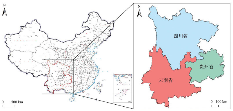 研究区域地理位置如图 2所示。云、贵、川地区位于中国西南部,地形复杂多样,涵盖云南省、贵州省和四川省,东临广西壮族自治区,西北邻近西藏自治区,南部毗邻缅甸、越南、老挝等国。这一地区不仅是中国西部大开发战略的重点区域,同时也是乡村旅游发展的重要目标地,是县域乡村旅游研究的理想案例。
