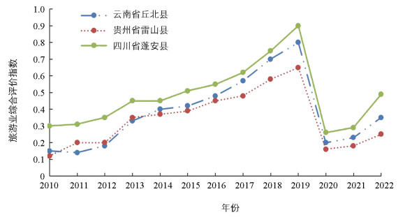 旅游发展水平的时间变化趋势如图 3所示。利用公式(15)-(18)得到2010-2022年云、贵、川地区丘北县、雷山县和蓬安县旅游业综合评价指数值。