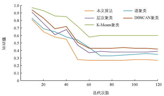 不同聚类算法的MAE比较结果如图 4所示。为了检验本文采用的多层次灰色聚类分析算法的性能,引入同一输入下评估指标的平均绝对误差(MAE)。MAE被选择为衡量聚类算法性能的关键指标,通过计算每个数据点到其相应簇中心的实际距离与预测距离之间的平均差异,直观地反映算法在特定数据集上的表现。MAE值越低,表示预测结果与实际值越接近,聚类效果越好。相较于其他评估指标,如均方误差(MSE)或均方根误差(RMSE),MAE的优势在于其对误差的处理较为直接,不会放大误差值的影响,从而提供更稳定、易解释的结果。将本文方法与常用的聚类方法进行比较,包括K-Means聚类算法、层次聚类算法、谱聚类算法和DBSCAN(Density-Based Spatial Clustering of Applications with Nois)聚类算法,得到实验结果。