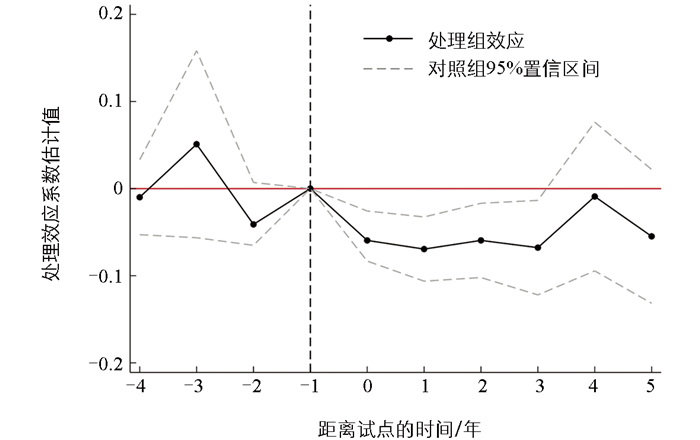 在政策执行前,处理组和对照组之间的差异无统计学意义是采用双重差分法的前提。本研究将基准年份设定为政策发生前1年,验证双重差分模型的适用性结果见图 1。新型城镇化建设实施前,处理组与对照组碳排放趋势的差异无统计学意义,处理效应系数趋近于0且无统计学意义,满足平行趋势假设。政策实施后两组之间的碳减排差异逐步显现:政策实施初期呈现显著负向处理效应,而政策实施第4~5年的效应值无统计学意义,说明新型城镇化试点政策对城市碳减排的驱动作用具有短期时效性特征,其政策效果随时间推移呈现边际递减规律。