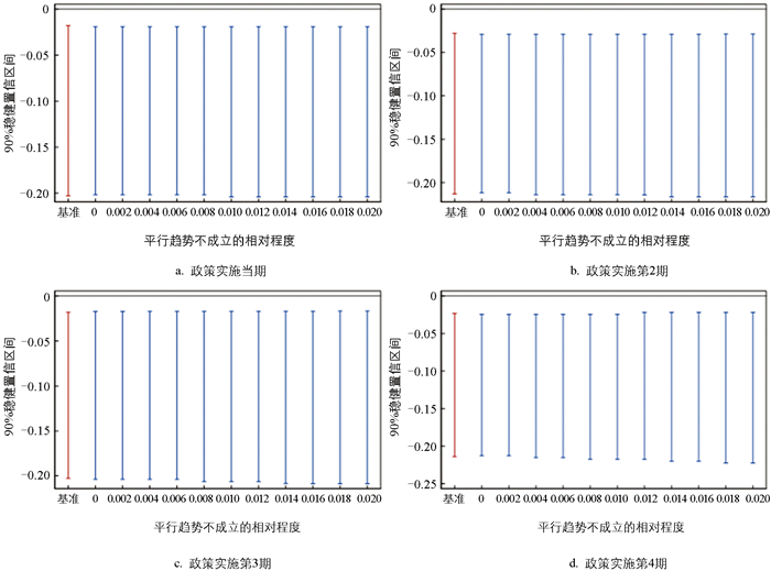 然而,最新的双重差分理论表明,政策前趋势检验对于双重差分的有效性既不充分也没有必要[27],传统的政策前趋势检验在统计学上具有较低的功效,会导致估计和推断中的偏差和扭曲。为此,文献[28]提出了一种违反平行趋势假设的检验方法,其核心思想是对处理后点估计量的置信区间进行推断和敏感性分析。检验包含两个部分:一是根据研究背景选择平行趋势假设的偏差度;二是构建每个偏差度对应的置信区间。如果处理后点估计量的置信区间在最大偏差度处不包含0,则说明处理效应对平行趋势的偏离具有较强的稳健性。本研究参考文献[29]的方法来检验试点政策实施后处理效应平行趋势的敏感性。除对政策实施年进行平行趋势敏感性检验,还对政策实施后第2期、第3期、第4期进行敏感性检验,结果如图 2所示。检验结果表明,即使平行趋势存在一定程度的偏离,新型城镇化建设仍然对碳减排具有显著的推动作用。