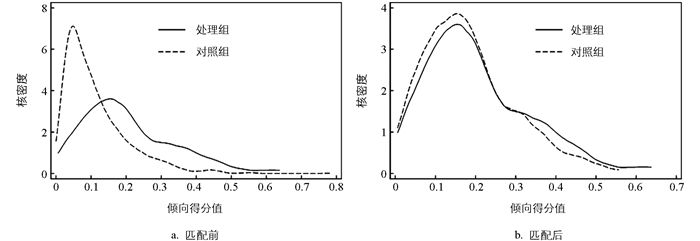 在使用倾向得分匹配—双重差分模型之前,需对倾向得分匹配的有效性进行检验。首先验证共同支撑假设,选取人口密度、土地城镇化水平、基础设施建设、政府规模和固定资产投资作为协变量。表 3汇报了各协变量平衡性检验的结果,匹配后共同支撑域内处理组与对照组样本分别为272和1 947个,样本损失量少,且除人口密度外各协变量标准偏差较匹配前显著降低。图 3的概率分布密度表明,匹配后两组倾向得分分布高度重叠,满足平衡性要求。综合检验结果证实,本研究采用的倾向得分匹配—双重差分模型具有统计合理性。