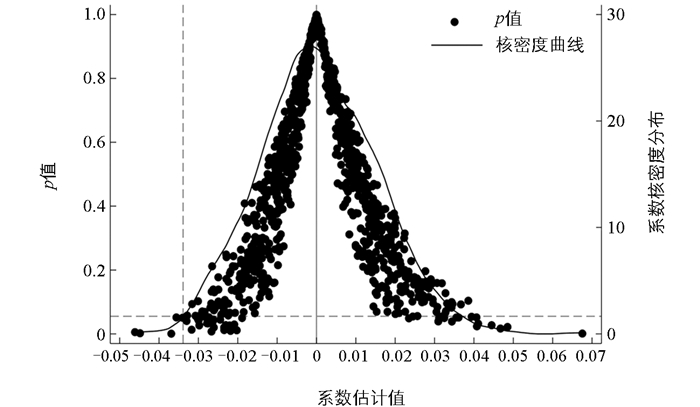 为了进一步排除其他外生政策冲击和不可观测的随机因素的影响,本研究采用随机设置的实验组和对照组进行安慰剂检验,并保持政策实施时间不变,然后重新估计基准回归模型,重复模拟1 000次以得到估计系数。图 4显示,随机构造的虚拟政策系数估计值以0为中心呈正态分布,且基准回归中核心解释变量的估计系数位于绝大部分虚拟系数分布之外,证实虚拟政策未产生显著影响。该检验结果排除了随机干扰的系统性偏误,证实了基准结果的稳健性。