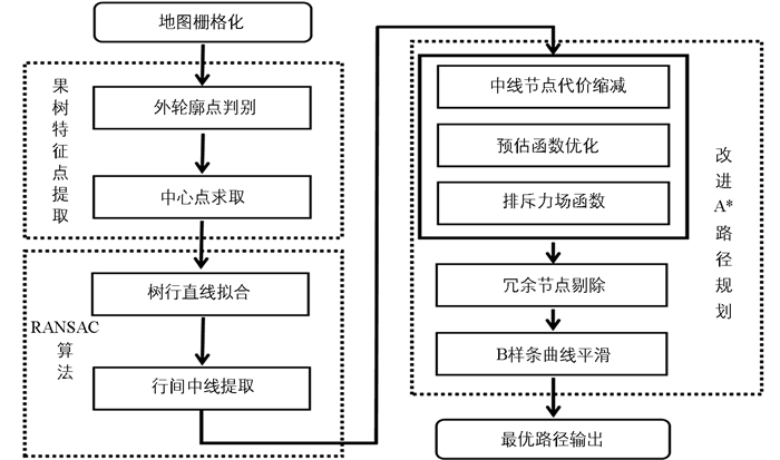 本文算法的整体实现框架如图 2所示,主要方法包括果树特征点提取、RANSAC算法、改进A*算法路径规划3个部分。具体流程如下:首先,栅格化果园地图,提取单株果树冠层外轮廓点和中心点等特征点;然后,利用RANSAC算法拟合树行直线并提取行间中线,为路径规划提供最优路径参考。最后,为解决传统路径规划算法搜索效率低、安全性不足、冗余节点多、路径平滑度差等局限性,引入中线栅格节点代价缩减机制、预估函数优化策略、排斥力场函数、冗余节点剔除方法以及B样条曲线平滑技术等优化策略改进A*算法,进行全局路径规划。