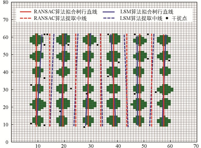 为测试RANSAC算法鲁棒性,在图 1(b)果园栅格地图中添加干扰点,以模拟果树冠层变化及偏移情况,并同时运行LSM与RANSAC算法进行对比实验,结果如图 3所示。由图 3可知,LSM算法因将干扰点也纳入直线拟合运算导致最终得到的树行直线发生偏斜,进而引起中线提取的偏移。而RANSAC算法能克服植株冠层不规则性与偏移带来的影响,筛选最佳特征点进行直线拟合,表现出更强的鲁棒性。
