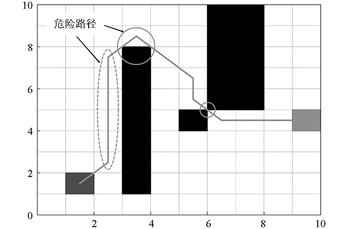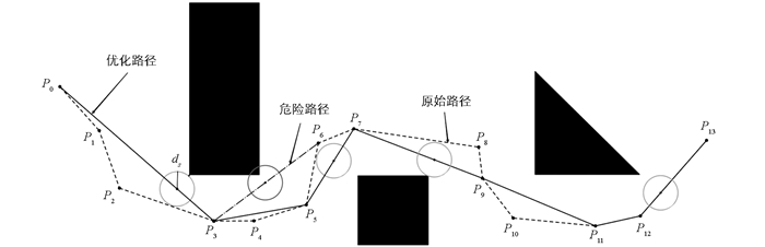 首先将所有路径节点都放入合集Pi中,从始发点P0开始,以P0、P1、P2 3个节点为一组,连接P0与P2,因连线间未接触障碍物,且该条线与最近障碍物的直线距离大于或等于设定的距离阈值,符合节点剔除条件,将P1从合集中剔除。接着将P0、P2、P3列为新的一组,重复上述判断。当P0与P4相连时,其连线因穿越障碍物而不满足条件,此时P0、P3连线达成最优路径。此后新一组的始发点将从P3节点开始,再次重复节点剔除程序。当所有路径节点都进行连线判断后,合集Pi中剩余的节点即为最优安全节点。