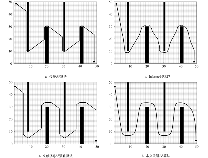 为验证本文所提出的改进A*算法的高效性及安全性,在一张50×50的静态栅格地图中,与传统A*算法、Informed-RRT*算法[31]和文献[32]A*演化算法进行对比,设定起点(2,49),终点(49,2)。仿真结果如图 6所示。传统A*算法与Informed-RRT*算法规划的全局路径在部分区域过于靠近障碍物,危险系数太高。文献[32]A*演化算法路径能与障碍物保持一定相对距离,但未剔除冗余节点,转折过多。本文改进的A*算法规划的全局路径相较于其他三者更安全、更平滑,能更好满足实际应用需求。