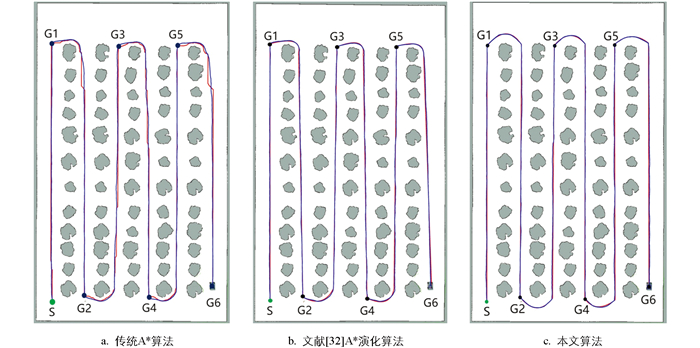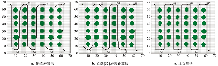 为验证本文RANSAC与改进A*结合算法的优越性,对比传统A*算法、文献[32]A*演化算法及本文算法在图 1(b)地图中的表现,设定起点(4,66),终点(64,4),且为将路径覆盖至所有作业区域,设置6个导航点(G1至G6)进行多点导航,仿真结果如图 7所示。传统A*算法规划路径过于贴近果树,无法满足机器人的安全作业需求。文献[32]A*演化算法安全性与平滑性有所提升,但部分区域转折节点较多,可能导致机器人频繁转向,降低行驶效率。经RANSAC算法获取行间中线后,本文算法规划的路径质量更高,能有效提升机器人在果树行间作业时的安全性和作业精度。