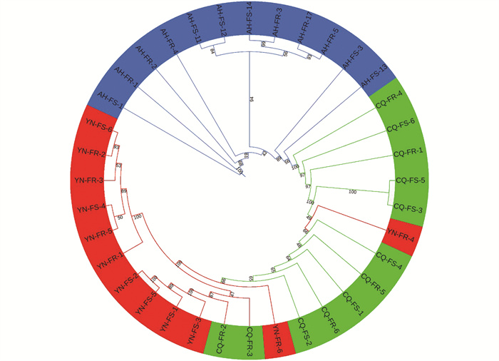 基于P450-SNP的中华按蚊系统进化树分析结果如图 1所示。36个中华按蚊样本按照地理种群聚类为3组,种群间的遗传差异和地理区域相对应。安徽12个样本中AH-FS-13、AH-FR-2自展值较低(<70%);而其他样本以较高的自展值聚类(>80%),说明这些样本可能来自共同祖先。云南12个样本中YN-FR-5、YN-FR-4、YN-FS-4、YN-FR-3自展值较低(<70%);而其他样本都以较高的自展值聚类(>80%),说明这些样本可能来自共同祖先。重庆12个样本中CQ-FR-3、CQ-FS-2、CQ-FR-6、CQ-FS-1、CQ-FR-5、CQ-FS-4自展值较低(<70%);而其他样本都以较高的自展值聚类(>80%),说明这些样本可能来自共同祖先。CQ-FS-5与CQ-FS-3以自展值100%聚类在一起,说明它们可能来自共同祖先。CQ-FR-2和CQ-FR-3与重庆种群其他样本显著分离,表明重庆种群的群内遗传差异较大,含有不同的祖先来源。