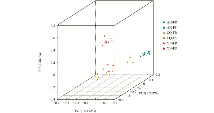 主成分分析结果如图 2所示。36个中华按蚊样本聚类与地理分布基本一致,其中云南(YN)和安徽(AH)种群各自形成独立聚类,而重庆(CQ)种群内部个体分散,表明其遗传多样性较高。此外,图 2中PC1、PC2和PC3分别代表第一、第二和第三主成分,其后方括号内的百分比(16.422%、5.991%、4.661%)为各主成分的方差贡献率,由eigenval.xls特征值文件计算得出。由此可知,主成分分析结果与系统进化树的分析结果一致。