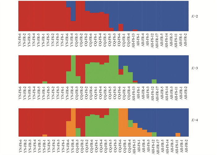 群体遗传结构分析结果如图 3所示。随着设定的祖代群体数K从2逐步提高至4,中华按蚊36个样本的群体结构呈现相应的动态变化。当K=2时,36个中华按蚊可划分为两个群体;当K=3时,重庆种群个体从云南和安徽种群中分化出来,36个中华按蚊样本可划分为3个群体;当K=4时,重庆种群的群内差异较大,产生了一个亚群。综上,群体遗传结构分析结果与系统进化树分析和主成分分析结果一致。