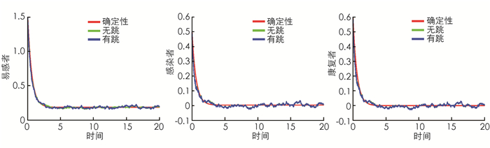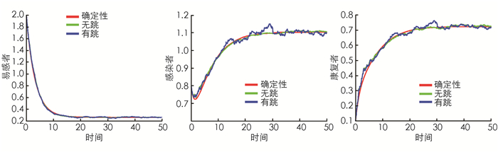 $0\le E{{V}_{2}}\left(x\left(t \right) \right)\le {{V}_{2}}\left(x\left(0 \right) \right)+E\int_{0}^{t}{{}}\left(-N\left({{\left(S-{{S}^{*}} \right)}^{2}}+{{\left(I-{{I}^{*}} \right)}^{2}}+{{\left(R-{{R}^{*}} \right)}^{2}} \right)+{{K}_{3}} \right))\text{d}t$ ,从而定理3得证.