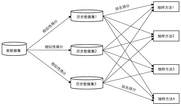图 2给出了由3个历史数据集和4种抽样方法组成的推荐网络结构. 在图 2中,第一层是新数据集,第二层的节点表示历史数据集. 第一层和第二层的连接权重是两个数据集之间的相似性得分. 此外,抽样方法都在第三层,排名得分作为第二层和第三层的连接权重. 在构建推荐网络后,根据所获得的推荐分数对所有抽样方法进行排序,并选择Top-N排序方法向新数据集推荐抽样方法.