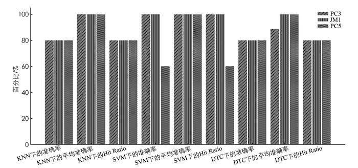 图 3给出了PC3,JM1和PC5在特定分类器下的准确率、平均准确率和Hit Ratio,由图 3可知,本文提出的抽样推荐算法在测试集上总的准确率达到了0.82,其准确率是非常高的,平均推荐的5种抽样方法中就有4种抽样方法在实际中表现良好. 平均准确率也是一个重要的推荐指标,在9次测试中,本文提出的算法就有8次的平均准确率为1,最差的也能达到0.8875,说明实际表现良好的抽样方法基本上都在推荐列表的前面. Hit Ratio的均值达到了0.823,根据这些评价指标综合考虑,可以看出本文提出的抽样推荐算法的推荐性能良好且可扩展性好,可以为用户推荐出适用的抽样方法.