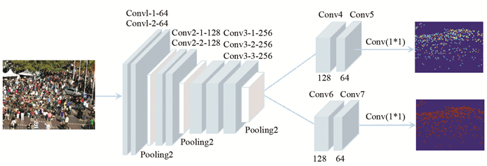 由于多任务学习方法能解决复杂背景干扰问题,且选择恰当的前端网络可以使得网络参数量减少,因此,本文提出了一个基于背景辅助的高效人群计数多任务学习网络(an efficient background assistance based multi-task network for crowd counting,BAMTLNet). 与人群计数网络中大量采用VGG[4]前10层作为前端网络不同,我们仅采用VGG[4]网络的前7层,以减少网络的参数量. 在后端网络中,我们提出了2个分支,分别是生成估计密度图主任务分支和复杂背景分割辅助任务分支. 生成估计密度图的主任务分支采用3个卷积层生成估计密度图,用于积分得到人数. 复杂背景分割辅助任务分支采用三层空洞卷积层生成背景分割图,利用多任务学习机制,为主任务分支提供背景的语义信息,优化网络参数,以降低复杂背景对计数的影响. 此外,我们为该多任务学习网络设计了背景辅助融合多任务损失函数. 经训练,该网络能在人群计数基准数据集上达到不错的效果,网络参数少,推理速度快.