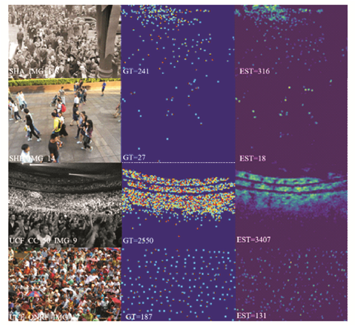 UCF_CC_50数据集[9]包含50张图像,人群数量变化大,十分具有挑战性. 由于其数据集太小,我们在训练时采用了五折交叉验证的方法.