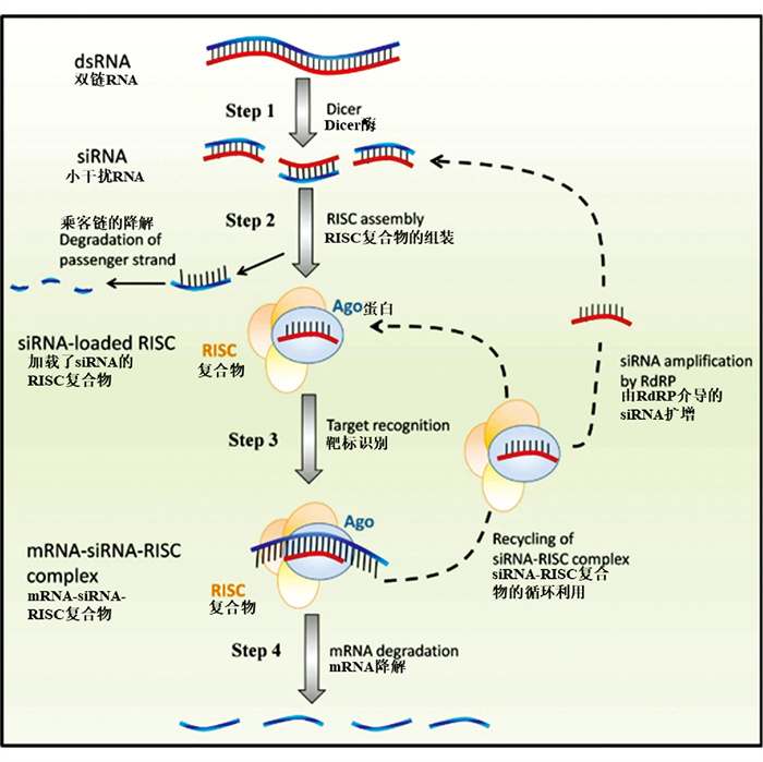 RNAi是一种保守的转录后基因沉默机制(图 1)[53]。简而言之,外源dsRNA进入昆虫细胞后,会被Dicer-2酶切割成小干扰RNA(Small Interfering RNA,siRNA)。siRNA的反义链随后被整合进RNA诱导沉默复合体(RNA-induced Silencing Complex,RISC),引导RISC识别并切割与其互补的靶标信使RNA(Messenger RNA,mRNA),最终导致目标基因的沉默[54-55]。
