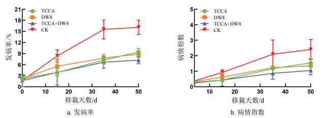 试验区内6月下旬开始发生根茎类病害,系统调查结果如图 1所示,随时间变化,试验区各处理的青枯病的发病率及病情指数逐渐上升。如表 6所示,各处理对烟草青枯病均有一定的相对防效,其中TCCA+DW8对青枯病防治效果最佳,发病高峰期相对防效达到66.57%。