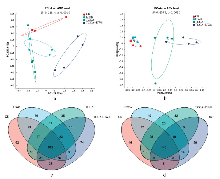 在ASV水平,利用基于Bray-Curtis的PCoA分析,不同处理后根际土壤细菌群落组成的差异如图 2a所示。第一主坐标(PC1)贡献率为24.55%,第二主坐标(PC2)贡献率为10.61%,DW8处理组、TCCA+DW8处理组和对照组明显分离,且DW8处理与对照组分离距离最远,各处理样品间的细菌群落组间差异大于组内差异,细菌群落差异显著(R2=0.348 4,p=0.001 0),表明生防菌(DW8)的添加会显著改变土壤中细菌群落结构。
