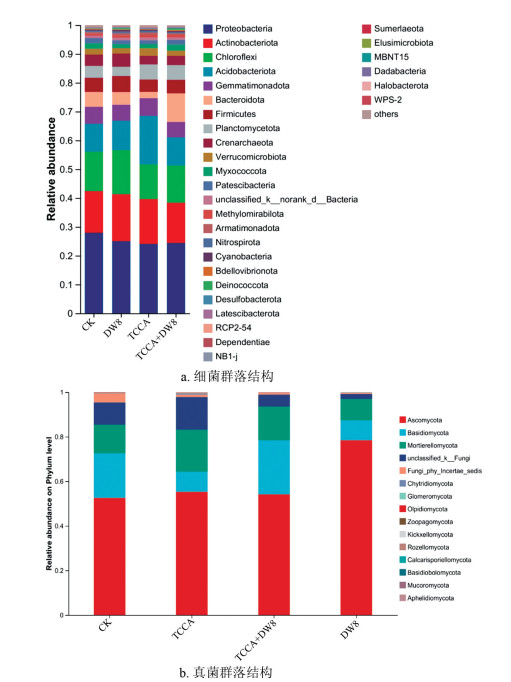 对不同处理根际土壤微生物测序数据进行α多样性分析,结果如表 7所示,不同处理的覆盖度指数均大于0.99,表明该群落结构的测序数据可以充分合理反映微生物群落的多样性和丰富度。表中Ace指数和Chao指数反映群落的丰富度,Shannon指数和Simpson指数反映群落的多样性。处理TCCA、DW8、TCCA+DW8和对照组的细菌、真菌Ace指数、Chao指数、Shannon指数和Simpson指数均无显著差异(表 7),表明处理未显著改变土壤微生物群落的物种丰富度或均匀度(p < 0.05)。