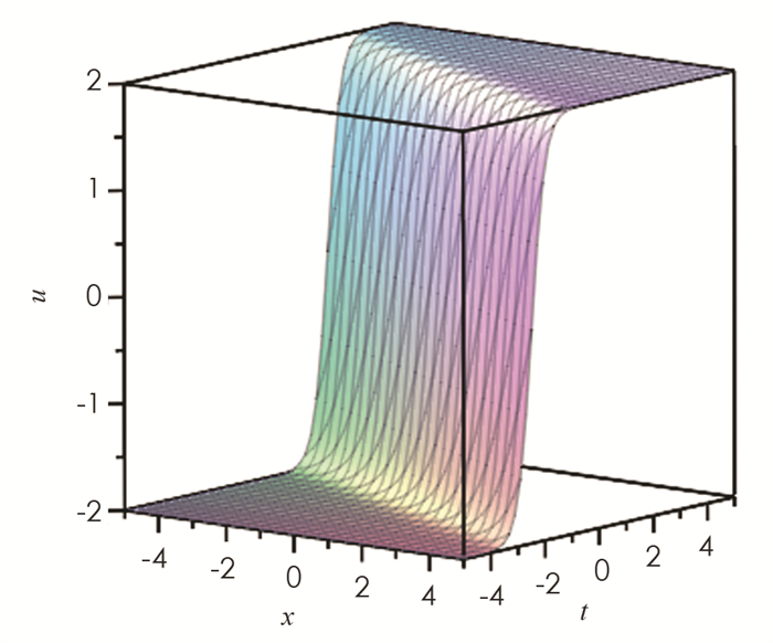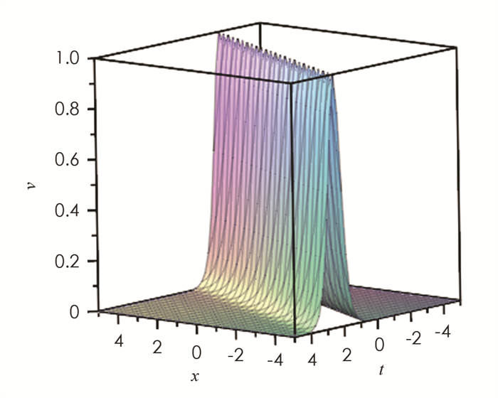 取参数值{k=1,h=3,b=0},利用MAPLE软件,我们得到孤立波相互作用解的波形图. 图 1为解u的波形图,是反扭结型孤立波,图 2为解v的波形图,是钟型孤立波.