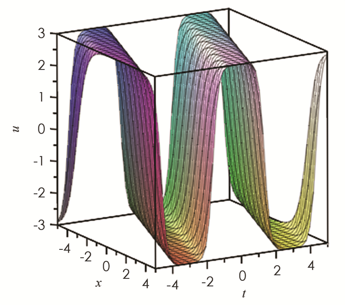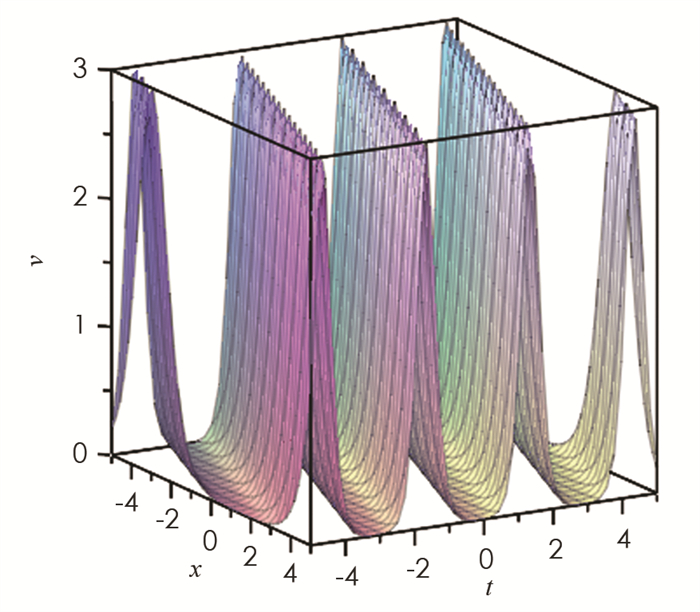 参数取值为{m=0.999,k2=1,h2=3},利用MAPLE软件,我们得到Tu方程(1)解的波形图,其中:图 3为解u的波形图,描述了椭圆周期波和反扭结型孤立波的相互作用;图 4为解v的波形图,描述了椭圆周期波和钟型孤立波的相互作用.